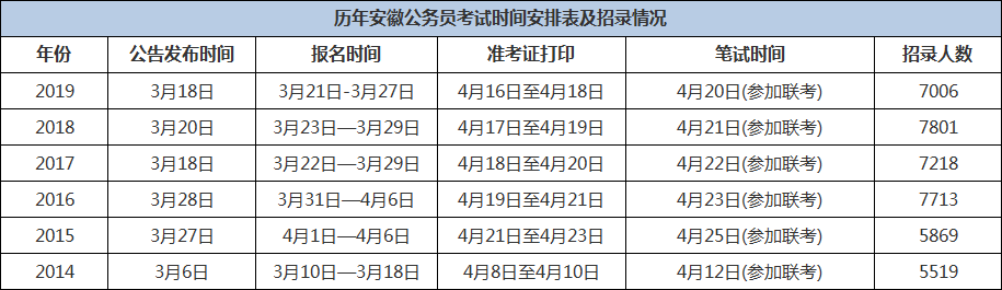 具體時間安排則要以2020年安徽公務(wù)員公告為準(zhǔn),歷年安徽省公務(wù)員考試時間安排及招錄情況供大家參考(如下圖):