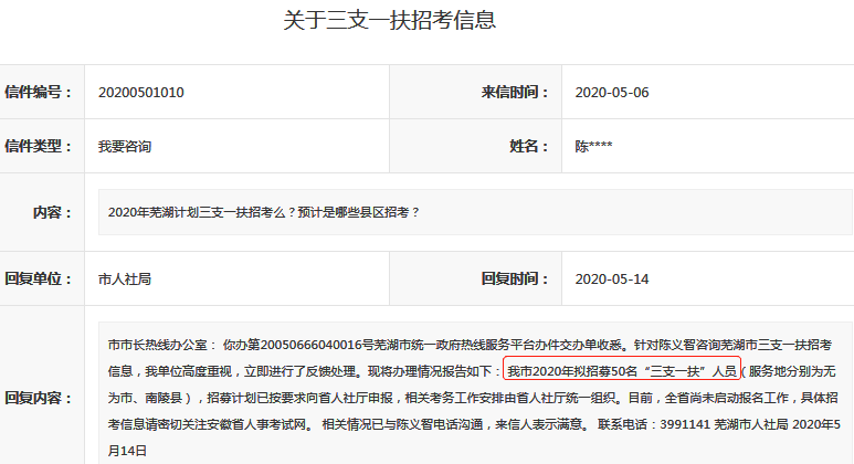 另外,2020年蕪湖市三支一扶計劃招50人(以下內(nèi)容及截圖來源于蕪湖市人民政府):