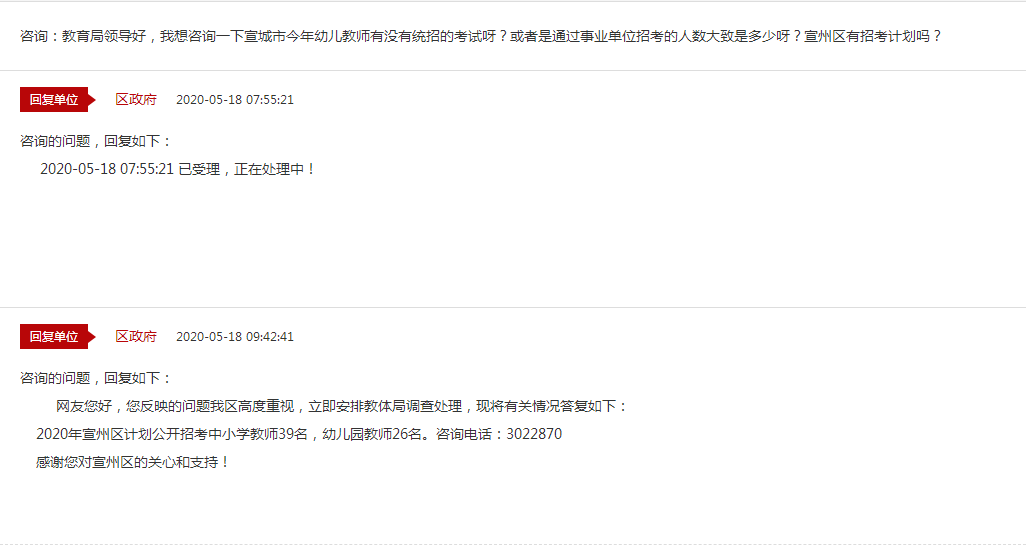 5月18日,有網(wǎng)友在宣城市人民政府互動(dòng)交流平臺(tái)提問(wèn):教育局領(lǐng)導(dǎo)好,我想咨詢一下宣城市今年幼兒教師有沒(méi)有統(tǒng)招的考試呀?或者是通過(guò)事業(yè)單位招考的人數(shù)大致是多少呀?宣州區(qū)有招考計(jì)劃嗎?宣城市宣州區(qū)政府給出了如下回復(fù):2020年宣州區(qū)計(jì)劃公開(kāi)招考中小學(xué)教師39名,幼兒園教師26名。更多安徽教師招聘咨詢,請(qǐng)關(guān)注2020年淮北教師招聘考試網(wǎng),后續(xù)會(huì)持續(xù)更新!
