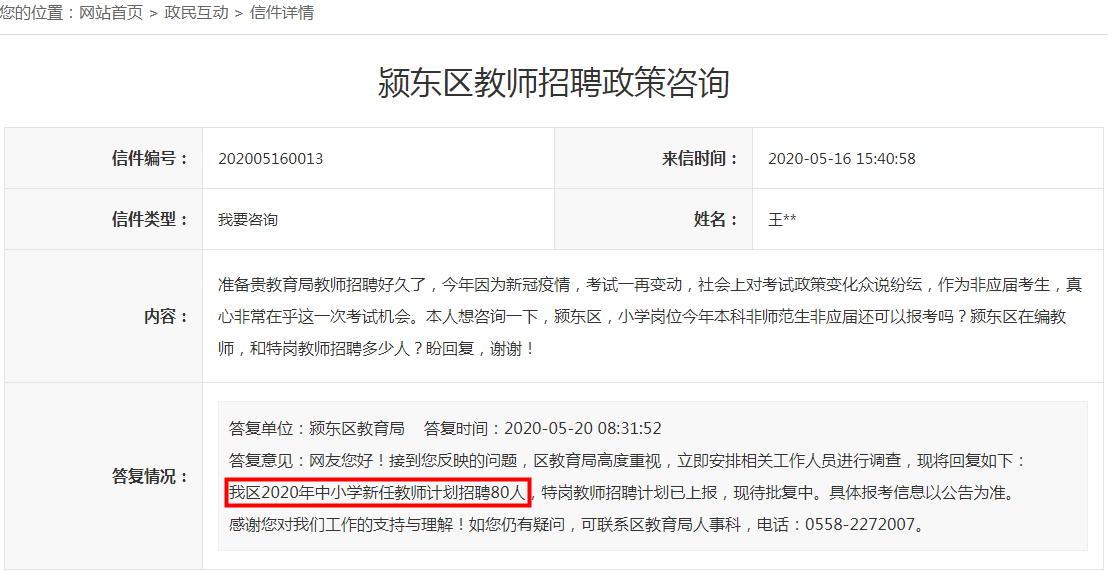 內(nèi)容:準(zhǔn)備貴教育局教師招聘好久了,今年因?yàn)樾鹿谝咔?,考試一再變?dòng),社會(huì)上對考試政策變化眾說紛紜,作為非應(yīng)屆考生,真心非常在乎這一次考試機(jī)會(huì)。本人想咨詢一下,潁東區(qū),小學(xué)崗位今年本科非師范生非應(yīng)屆還可以報(bào)考嗎?潁東區(qū)在編教師,和特崗教師招聘多少人?盼回復(fù),謝謝!答復(fù)情況: