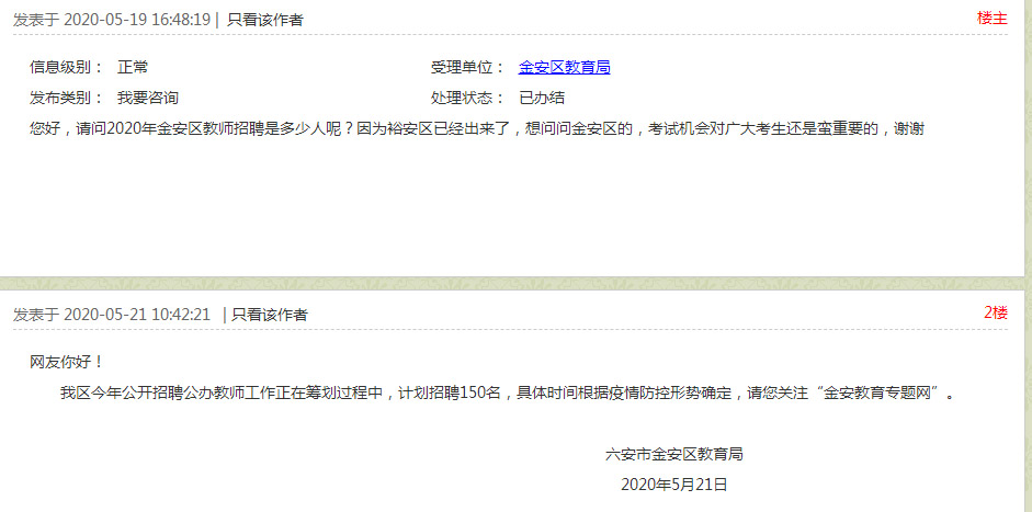 我區(qū)今年公開招聘公辦教師工作正在籌劃過程中,計劃招聘150名,具體時間根據(jù)疫情防控形勢確定,請您關注“金安教育專題網(wǎng)”。
