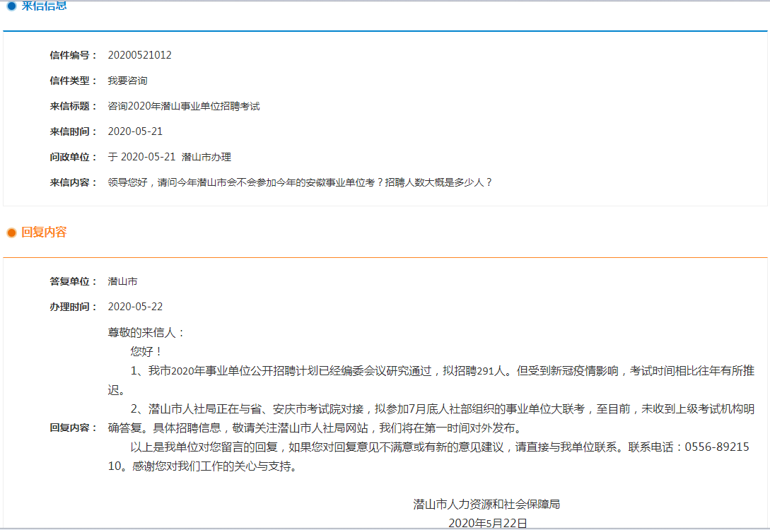 來信內(nèi)容:領(lǐng)導(dǎo)您好,請問今年潛山市會不會參加今年的安徽事業(yè)單位考?招聘人數(shù)大概是多少人?