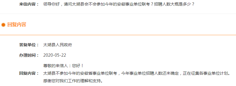 來信內(nèi)容:領導你好,請問太湖縣會不會參加今年的安徽事業(yè)單位聯(lián)考?招聘人數(shù)大概是多少?