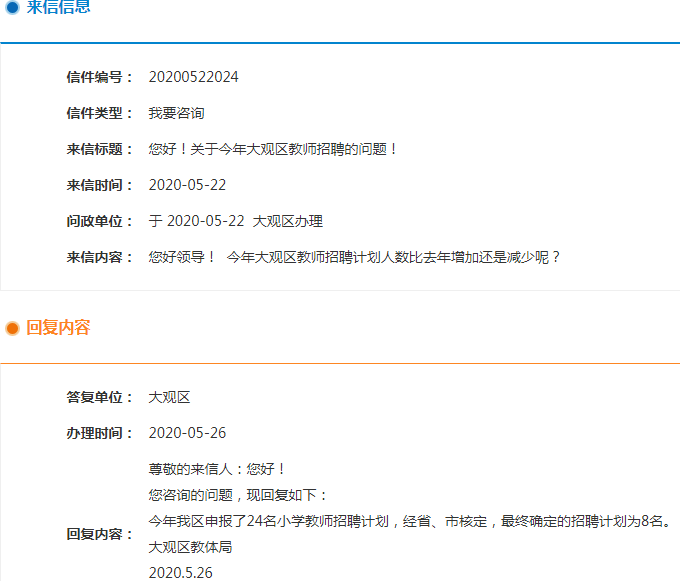 來信內(nèi)容:您好領(lǐng)導! 今年大觀區(qū)教師招聘計劃人數(shù)比去年增加還是減少呢?