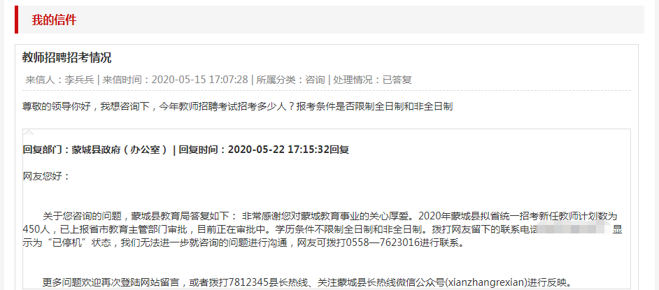 更多問題歡迎再次登陸網(wǎng)站留言,或者撥打7812345縣長(zhǎng)熱線、關(guān)注蒙城縣長(zhǎng)熱線微信公眾號(hào)(xianzhangrexian)進(jìn)行反映。