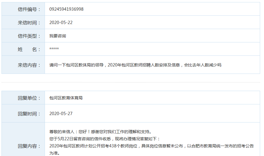 回復(fù)內(nèi)容:尊敬的來信人:您好!感謝您對我們工作的理解和支持。您于5月22日留言咨詢的信件收悉,現(xiàn)將辦理情況答復(fù)如下:2020年包河區(qū)教師計(jì)劃公開招考438個(gè)教師崗位,具體崗位信息暫未公布,以合肥市教育局統(tǒng)一發(fā)布的招考公告為準(zhǔn)。
