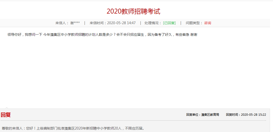 尊敬的來信人:您好!上級編制部門批準潘集區(qū)2020年新招聘中小學(xué)教師20人,不限應(yīng)歷屆。