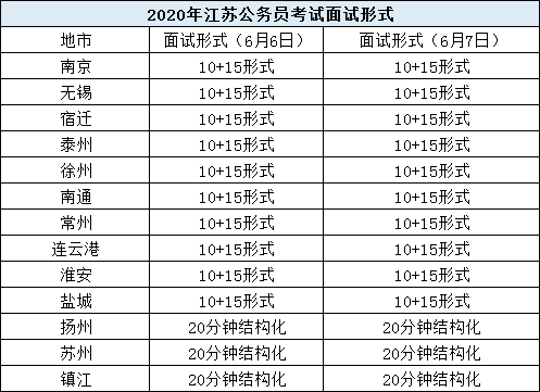 今年采用10+15模式的面試形式比較多,只有揚(yáng)州、蘇州、鎮(zhèn)江采用的是20分鐘結(jié)構(gòu)化的形式(如下圖):