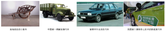 淮海戰(zhàn)役的小推車;中國第一輛解放牌汽車; 首輛中外合資的汽車; 我國首個擁有核心技術的新能源汽車??吹竭@四幅圖片你想到了什么?