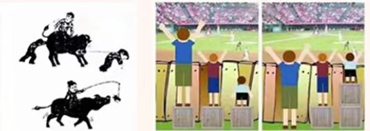 右邊漫畫:左邊是三個(gè)人(從左到右身高依次遞減),踩著同樣的方箱趴在墻外看足球場(chǎng)上人踢足球。右邊是同樣場(chǎng)景,但是三個(gè)不同身高的人下面踩的方箱依次遞增。對(duì)此,你想到了什么?