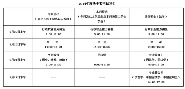 以下為2014年政法干警招錄考試科目及時(shí)間安排: