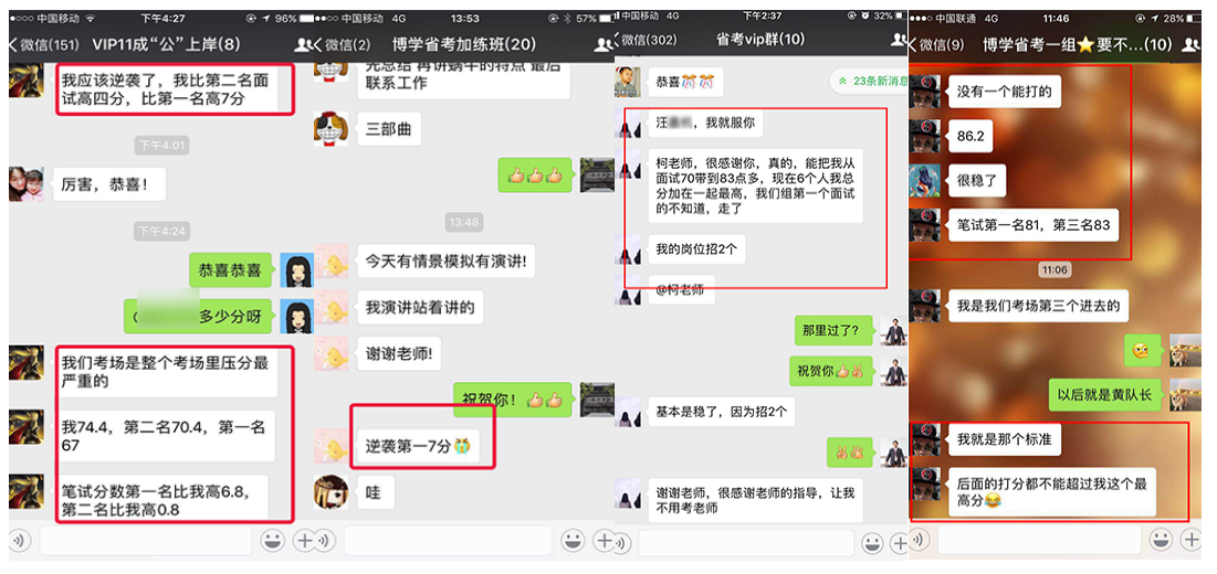 在2010年—2018年國考中,很多人僅僅是因為看了網(wǎng)上博學(xué)教育公務(wù)員班的幾段視頻,就毫不猶豫地選擇博學(xué)教育,最終成功地實現(xiàn)了他們的公務(wù)員之夢。2010年安徽省考高陽同學(xué)面試取得88.4的高分,一舉從筆試第23名躍居為綜合排名第一名,成為巢湖市面試狀元;胡卓然同學(xué)以86分的成績勇奪南京市第一名,被南京市國土資源局錄取。廣東的鄭滋潤同學(xué),數(shù)次公考面試失敗,2011年慕名來到博學(xué)施老師門下,經(jīng)過七天學(xué)習(xí),脫胎換骨,以91分的成績遙遙領(lǐng)先對手被財政部駐深圳市專員辦錄取!2011年安徽省考季毓同學(xué)面試取得88的高分,成為馬鞍市面試狀元;2012年上海的潘安安同學(xué),以88.3的高分被上海海關(guān)隸屬海關(guān)通關(guān)業(yè)務(wù)部門錄取。2013年福建的王子熙同學(xué),以89.4的高分被廈門海關(guān)廈門地區(qū)隸屬海關(guān)或辦事處錄取。2013年安徽省考牛園園同學(xué)取得面試86.8分,成為亳州市面試狀元!2014年安徽的曹珍同學(xué),以86.8的成績勇奪安徽省直面試狀元,被安徽省女子監(jiān)獄錄取。2015年國考安徽的曹燦同學(xué),以92.25分的成績被中國銀行業(yè)監(jiān)督管理委員會安徽監(jiān)管局錄?。?015年安徽省考陳雯同學(xué)以面試87.2的高分勇奪蕪湖市面試狀元;趙錦同學(xué)以面試86.4的高分取得天長市面試狀元;查菁文同學(xué)以面試86的高分取得定遠縣面試狀元。2016年國考面試,張雨豪以91分的成績被甘肅省國家稅務(wù)局錄取。2016年安徽省考陳蓉同學(xué)以面試86.8分取得馬鞍山市非鄉(xiāng)鎮(zhèn)公務(wù)員面試狀元;2017年國考,劉大偉勇奪山東省面試狀元,以98.67分被商務(wù)部錄??;阮帆同學(xué)面試取得91.33分,上海市國稅錄??;鄭想同學(xué)面試取得90.3分,上海國稅錄;2017年安徽省考顧博賢同學(xué)以面試88分取得利辛縣非鄉(xiāng)鎮(zhèn)公務(wù)員面試狀元。2018年國考徐起以87.33分被中央國家機關(guān)工委錄取,夏鈺以88.33分被中國浦東干部學(xué)院錄取。2018年安徽省考,周陽以83.8分取得銅陵市鄉(xiāng)鎮(zhèn)層級面試狀元;魏宇以82.8分取得亳州市鄉(xiāng)鎮(zhèn)層級面試狀元!
