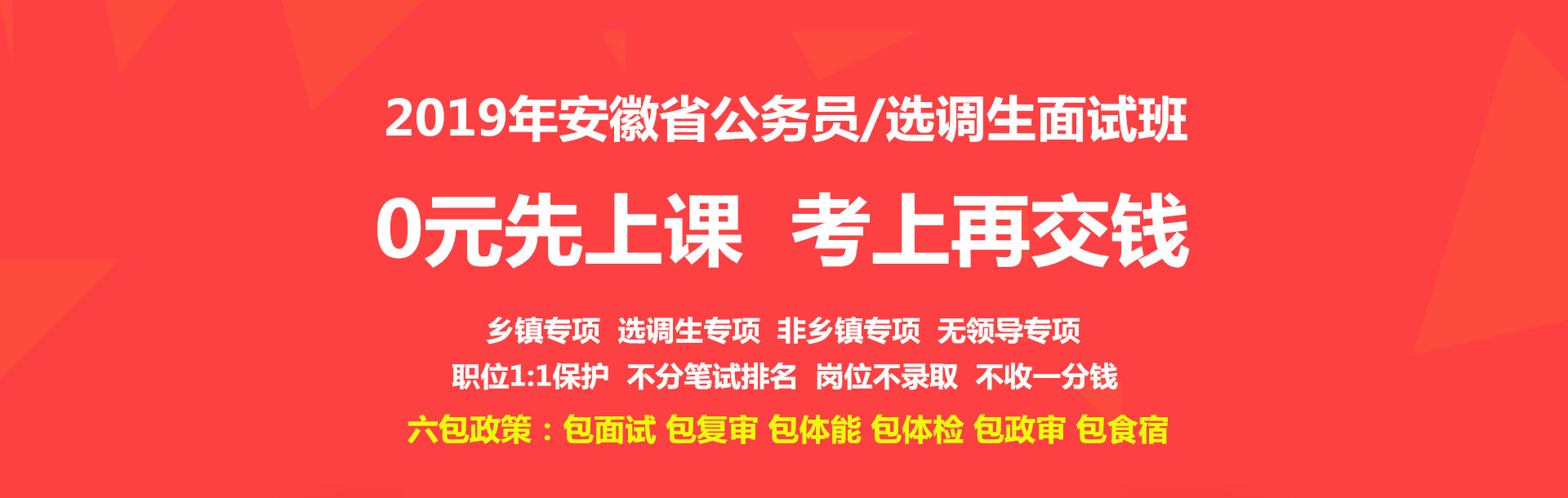 安徽省公務員面試由省委組織部和省人力資源和社會保障廳總負責,全省統一命題,統一時間進行面試。從2016年開始,安徽省公務員面試按照鄉(xiāng)鎮(zhèn)崗位、非鄉(xiāng)鎮(zhèn)崗位分類面試:2018年鄉(xiāng)鎮(zhèn)、選調生職位6月22日—6月24日面試,非鄉(xiāng)鎮(zhèn)職位7月13日—7月15日面試,每天一套題目。2019年鄉(xiāng)鎮(zhèn)、選調生職位面試時間官方確認 :6月下旬(博學預測:6月21日-23日); 非鄉(xiāng)鎮(zhèn)職位面試官方確認:7月中旬 (博學預測:7月12日—14日)。